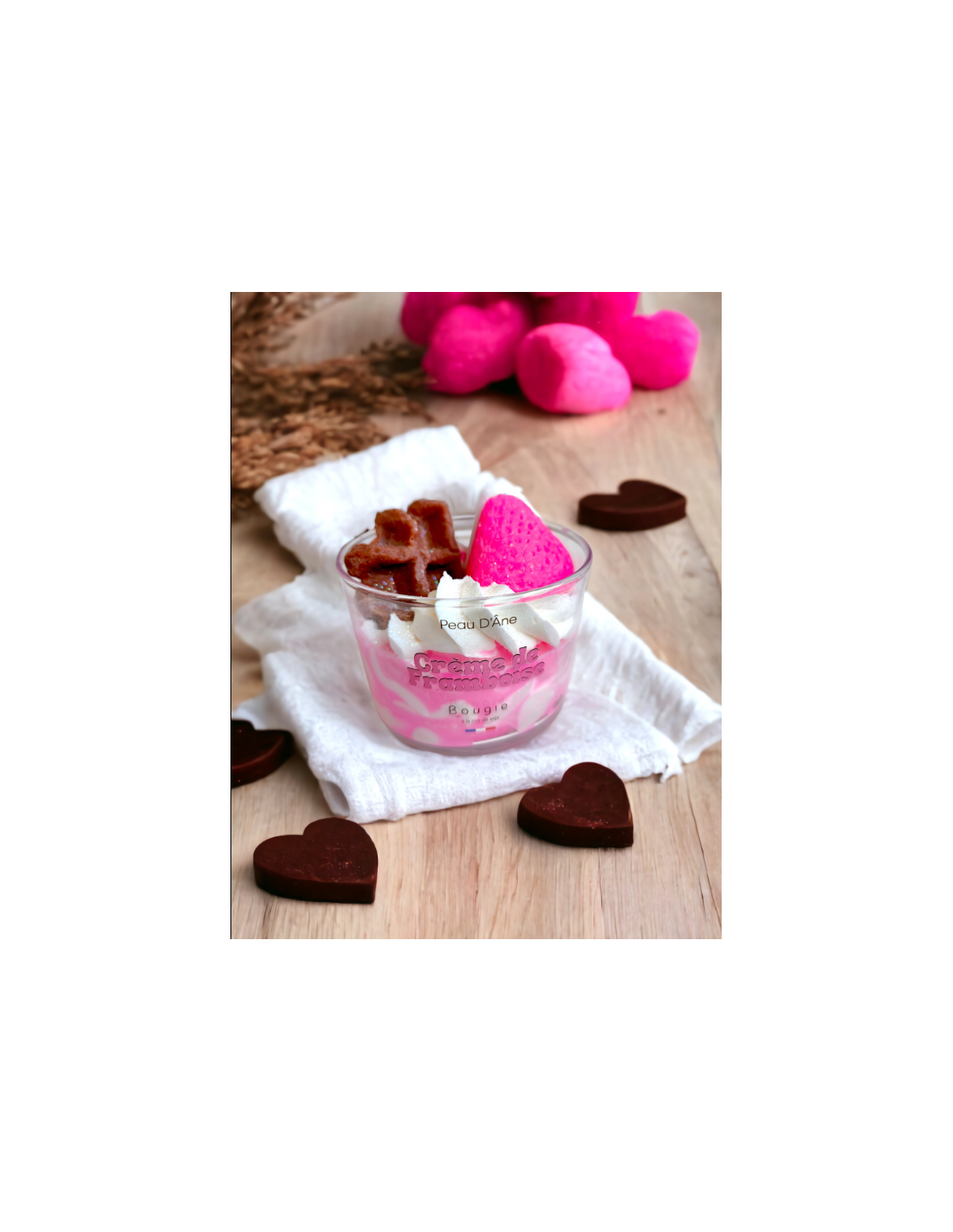 La bougie parfumée crème de framboise pour 100% de gourmandise. Toutes nos bougies sont à la cire de soja respectueuse de l'environnement et avec une mèche en coton.