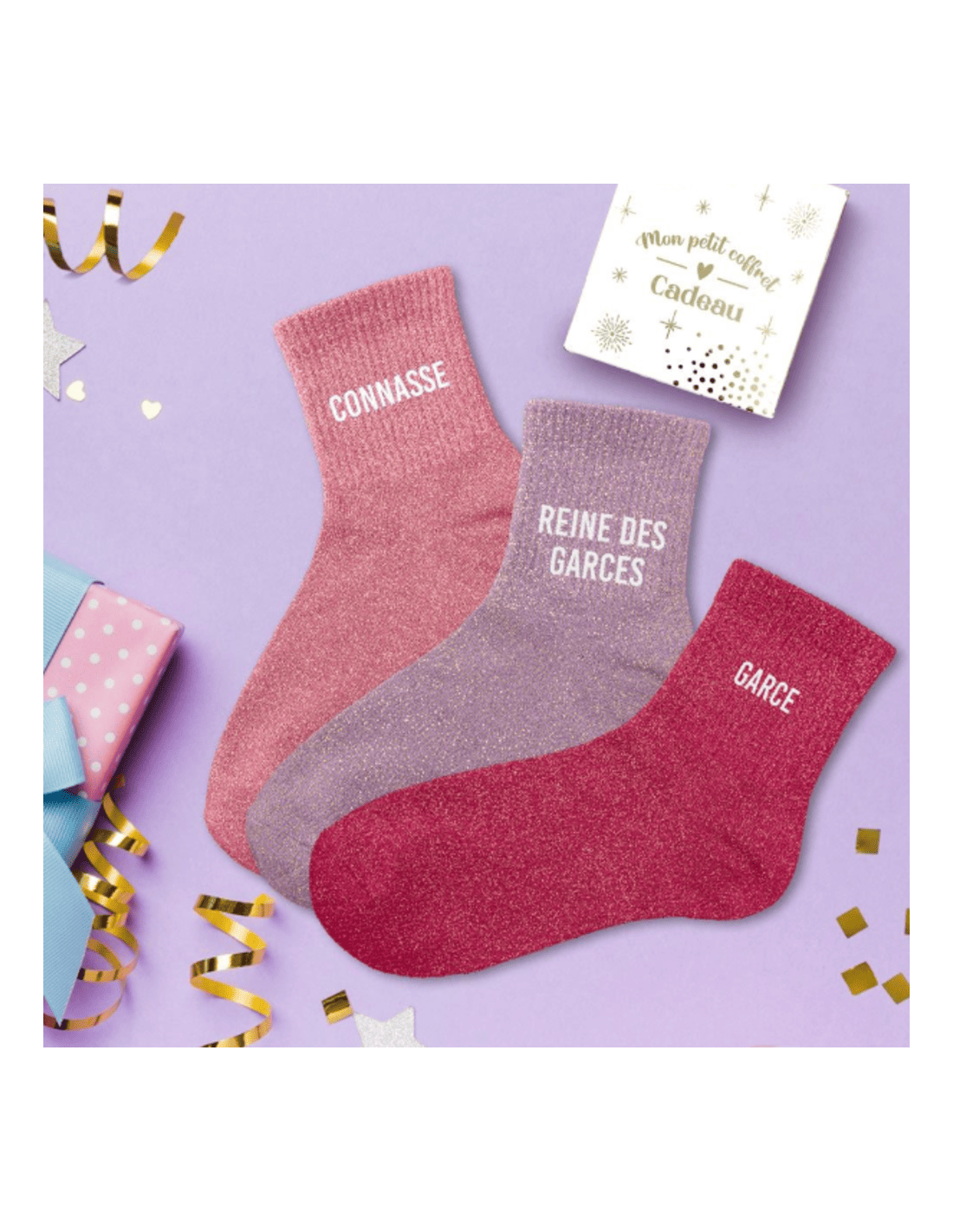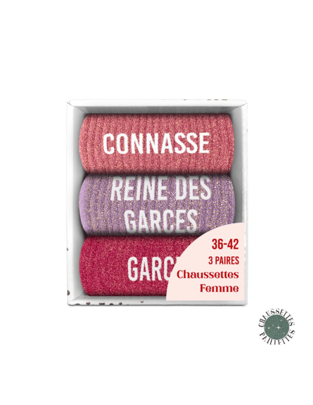 COFFRET TRIO CHAUSSETTES PAILLETTES CONNASSE. Ce coffret trio de chaussettes paillettes est une idée cadeau idéale à offrir en cadeau à une proche en toutes circonstances.