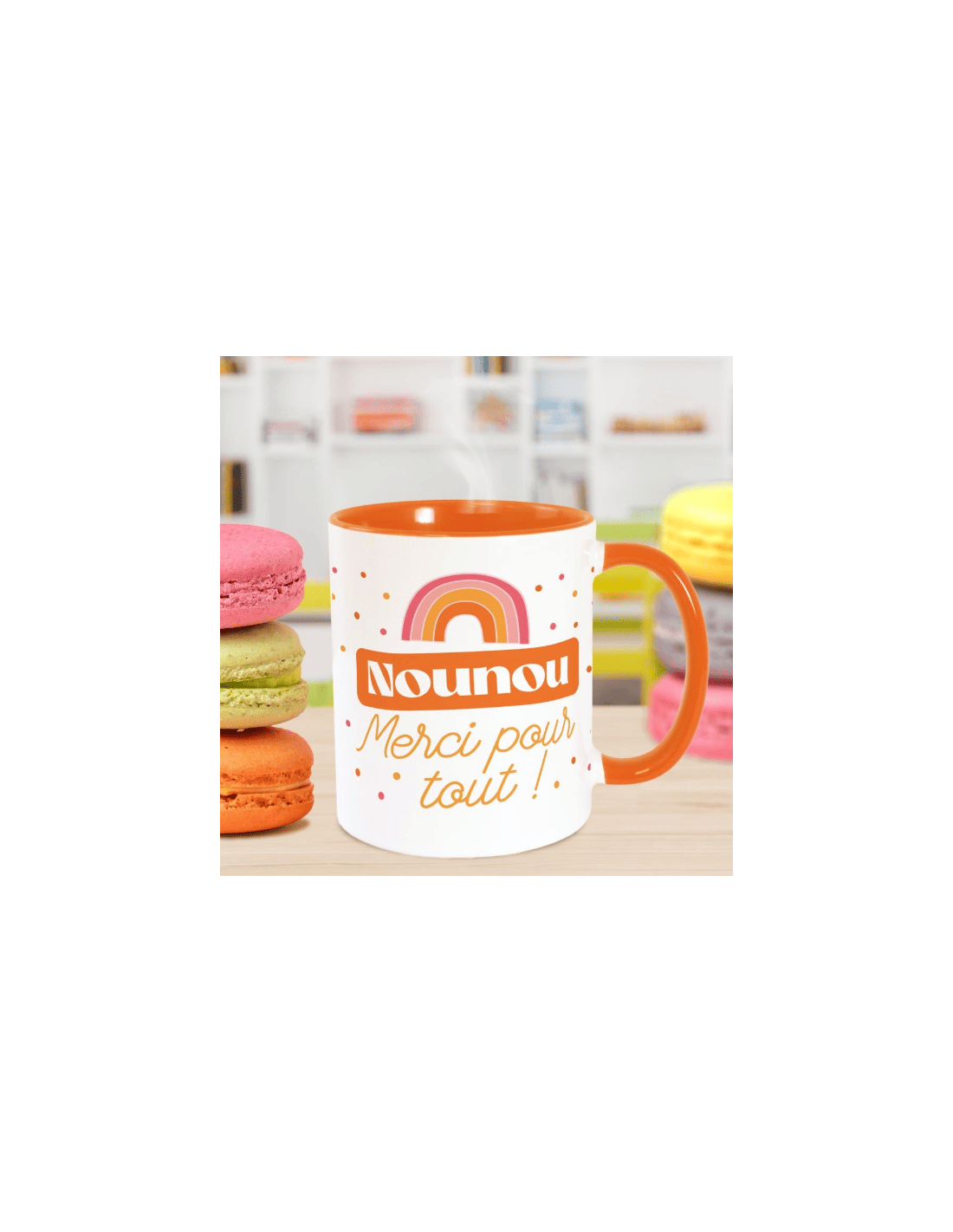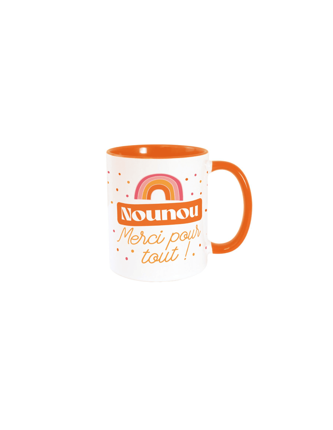 MUG ORANGE NOUNOU MERCI. Ce mug "Nounou merci pour tout" est une idée cadeau originale pour montrer à votre nounou toute votre reconnaissance et que vous tenez à elle. Grand sourire aux lèvres garanti !