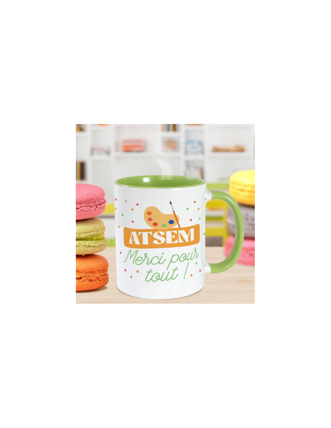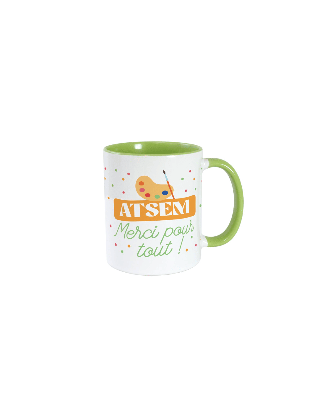 MUG VERT ATSEM MERCI. Ce mug "ATSEM merci pour tout" est une idée cadeau originale pour montrer à votre ATSEM toute votre reconnaissance et que vous tenez à elle. Grand sourire aux lèvres garanti !