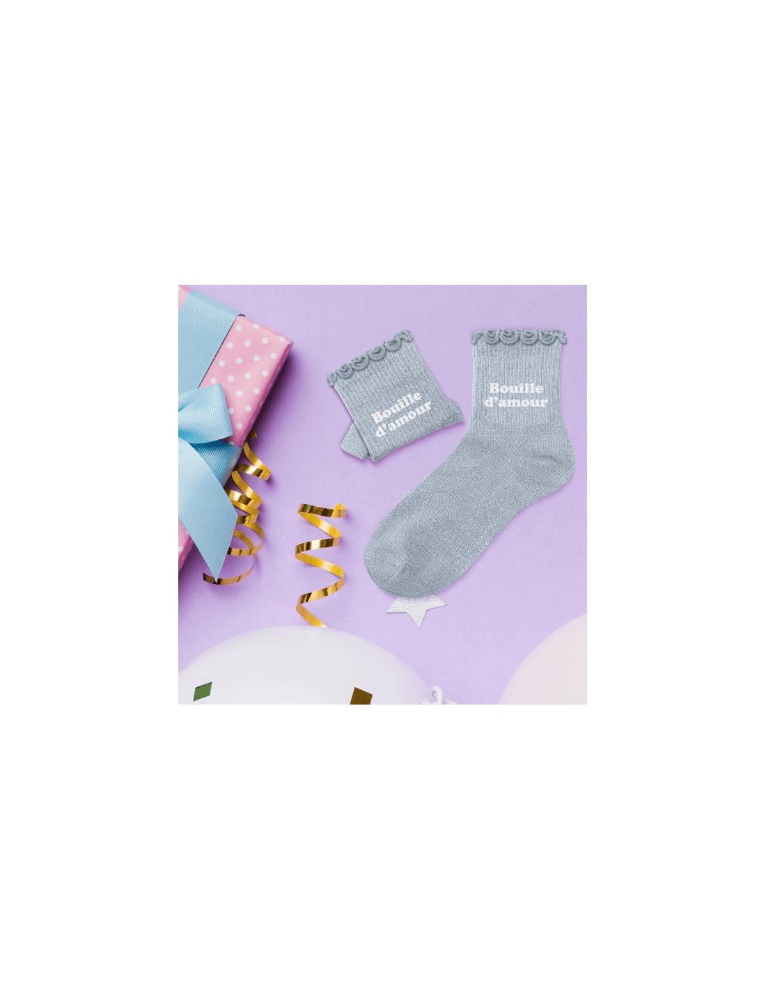 Ces chaussettes grises à paillettes avec la mention blanche "Bouille d'amour" sont la garantie d'un élément textile confortable et adorable pour une tenue ravissante.