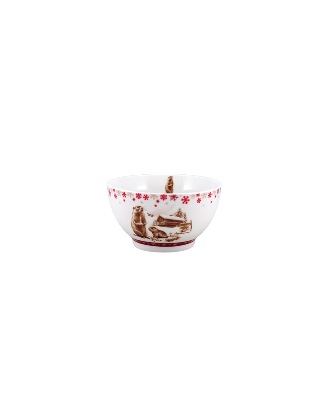 Ce qui distingue le bol BIANCA, c’est avant tout son motif montagnard finement travaillé. Une scène typique de la vie en montagne s’invite sur votre table : deux marmottes adorables prennent la pose devant un chalet enneigé, entourées de sapins et de flocons rouges qui évoquent la magie de l’hiver. Chaque détail du dessin a été pensé pour recréer l’ambiance authentique et apaisante de la montagne.