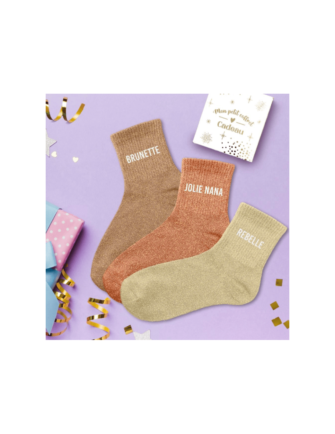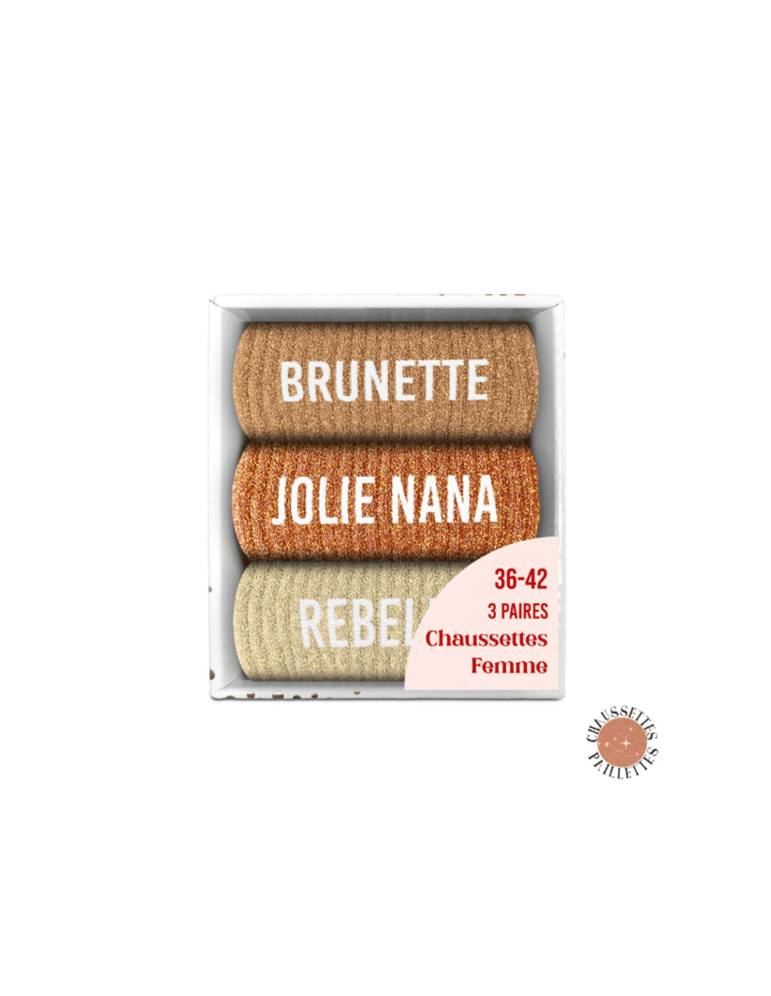 Confort garanti en portant ces 3 paires de chaussettes paillettes : l'une est brune avec la mention "Brunette", une est marron avec "Jolie Nana" et la dernière est grise avec "Rebelle".