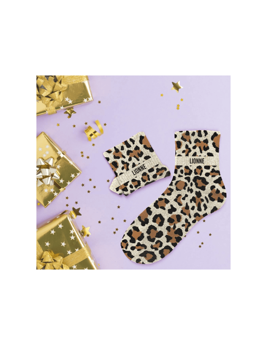 Ces chaussettes à paillettes beige motif léopard ornées de la mention "lionne" en noir sont la garantie d'un style scintillant, élégant en enveloppant vos pieds de douceur.