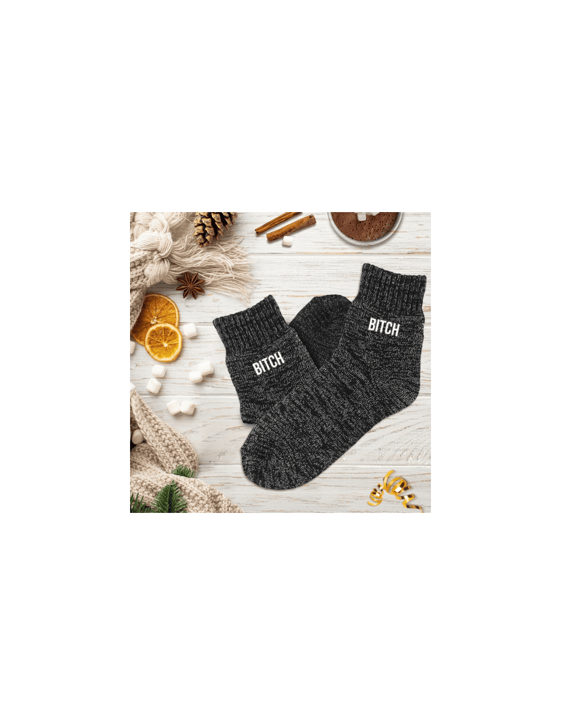Ces chaussettes noires avec la mention "bitch" en blanc sont la garantie d'un confort et d'une bonne idée de cadeau remplie de chaleur