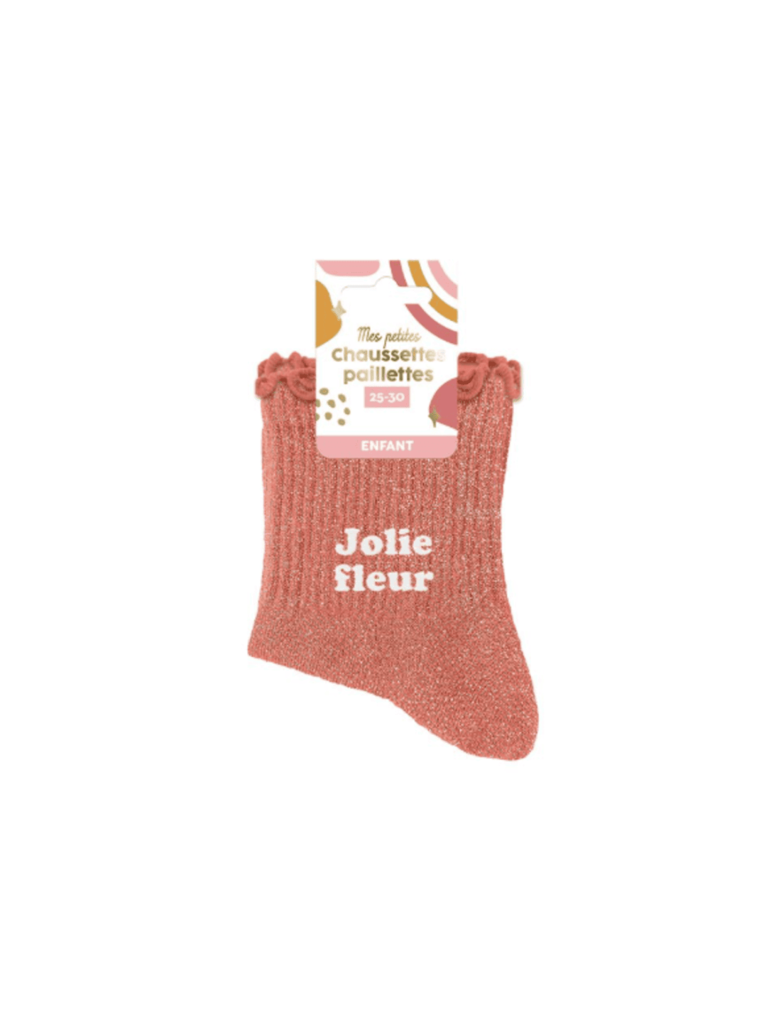 Ces chaussettes roses à paillettes avec la mention blanche "Jolie fleur" sont la garantie d'un élément textile confortable et adorable pour une tenue ravissante.