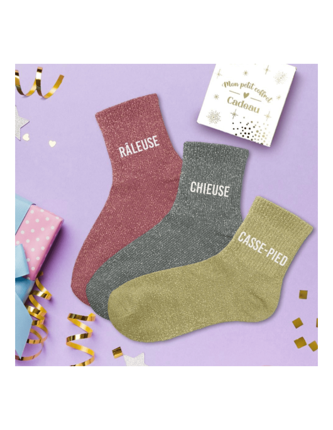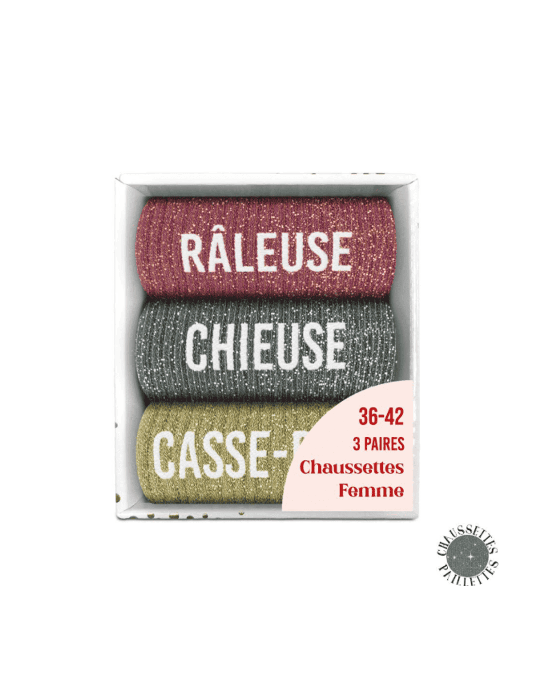 COFFRET TRIO CHAUSSETTES PAILLETTES RÂLEUSE. Ce coffret trio de chaussettes paillettes est une idée cadeau idéale à offrir en cadeau à une proche en toutes circonstances.