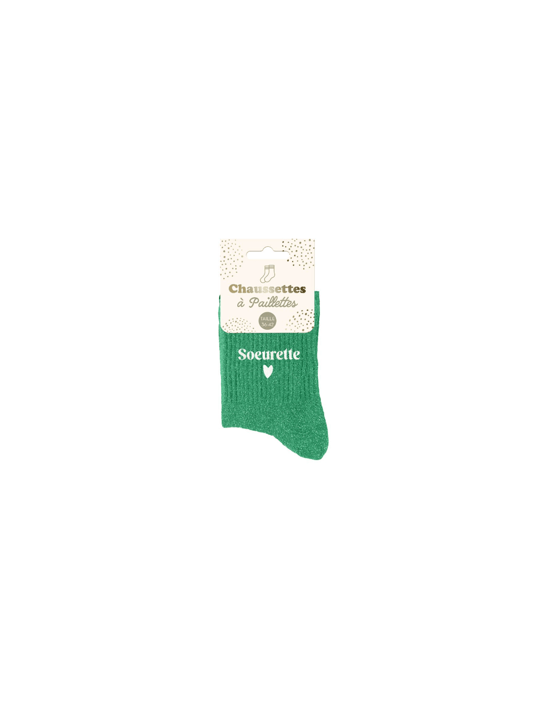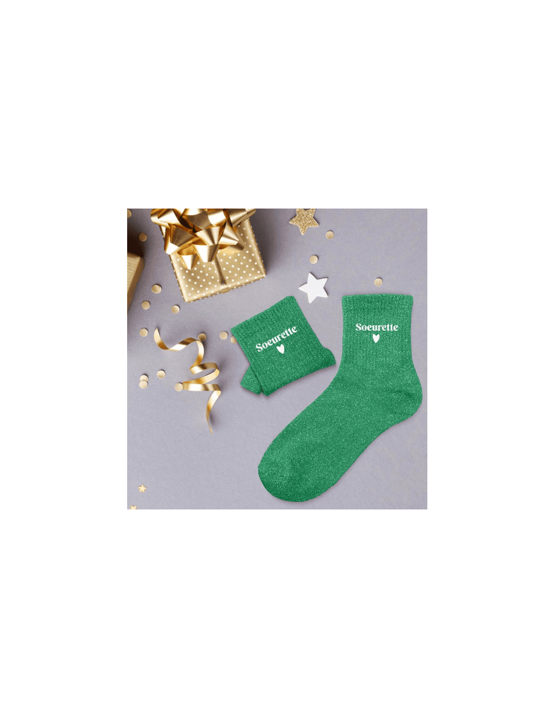 Ces chaussettes vertes à paillettes avec la mention "soeurette" en blanc sont la garantie d'un look éclatant