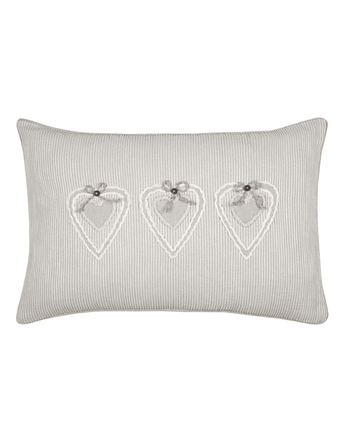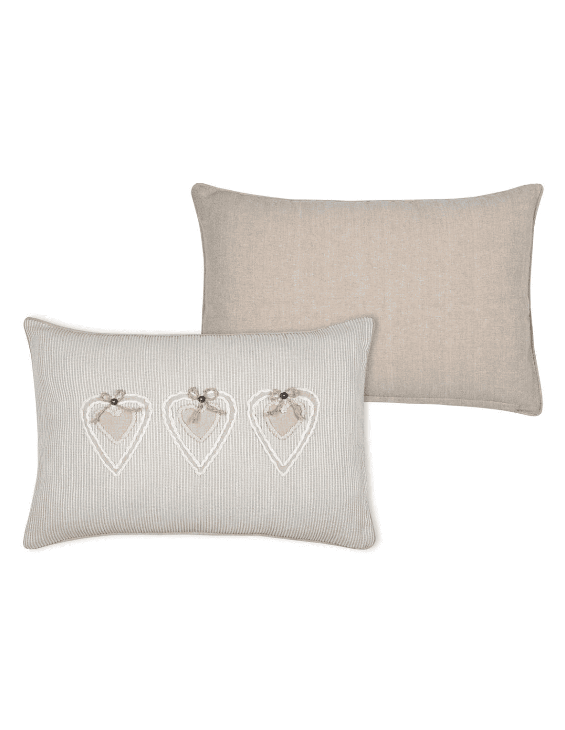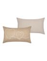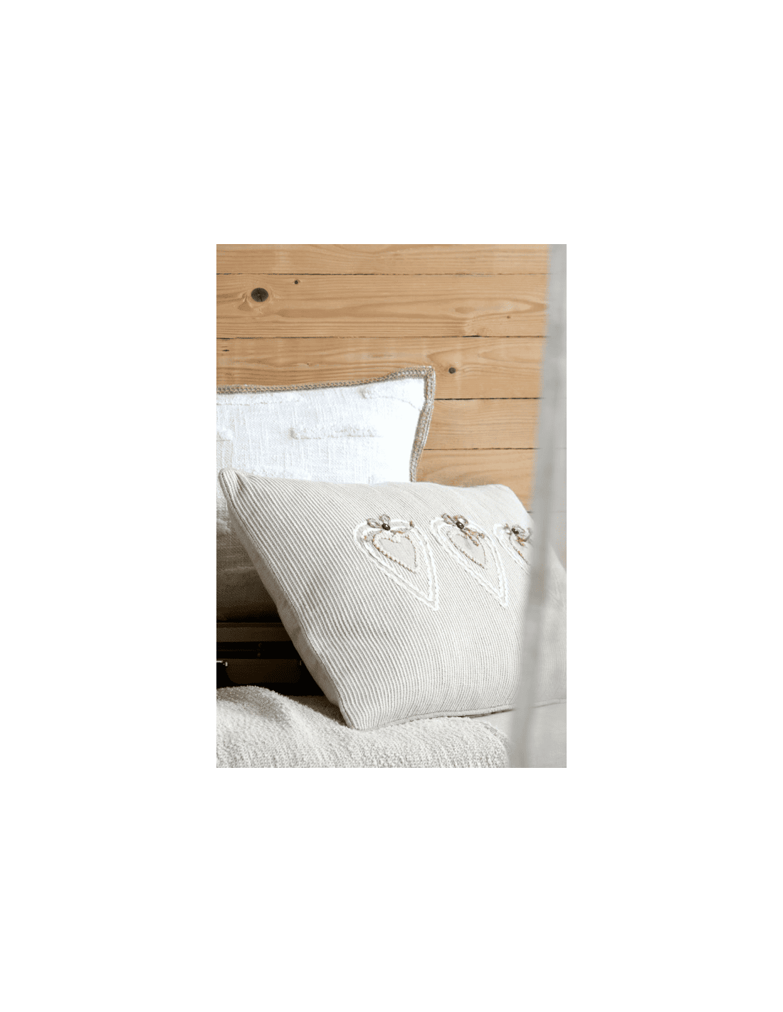 Le coussin JOSEPHA naturel 40x60 cm apporte une touche de douceur et d’élégance à votre intérieur. Confectionné dans une teinte naturelle intemporelle, il s’intègre facilement à tous les styles de décoration, du bohème au contemporain. Son design délicat se distingue par de fines bandes blanches brodées qui structurent harmonieusement la surface du coussin. Au centre, trois cœurs subtilement brodés attirent le regard et ajoutent une note romantique et chaleureuse. Chaque cœur est délicatement orné d’un petit nœud, apportant un détail raffiné et artisanal qui fait toute la différence.