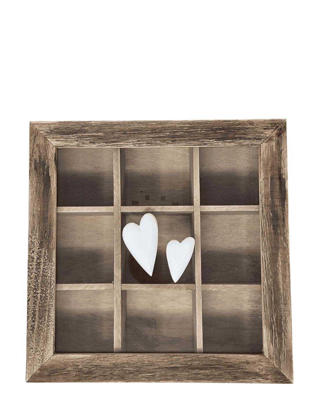 Mais cette boîte n’est pas seulement fonctionnelle : c’est également un véritable objet de décoration en bois. Posée sur une étagère, un plan de travail ou une table, elle crée une ambiance chaleureuse et conviviale dans votre cuisine ou votre salon. Les cœurs blancs peints sur la vitre apportent une note tendre et poétique, idéale pour les amateurs de décoration douce et naturelle.