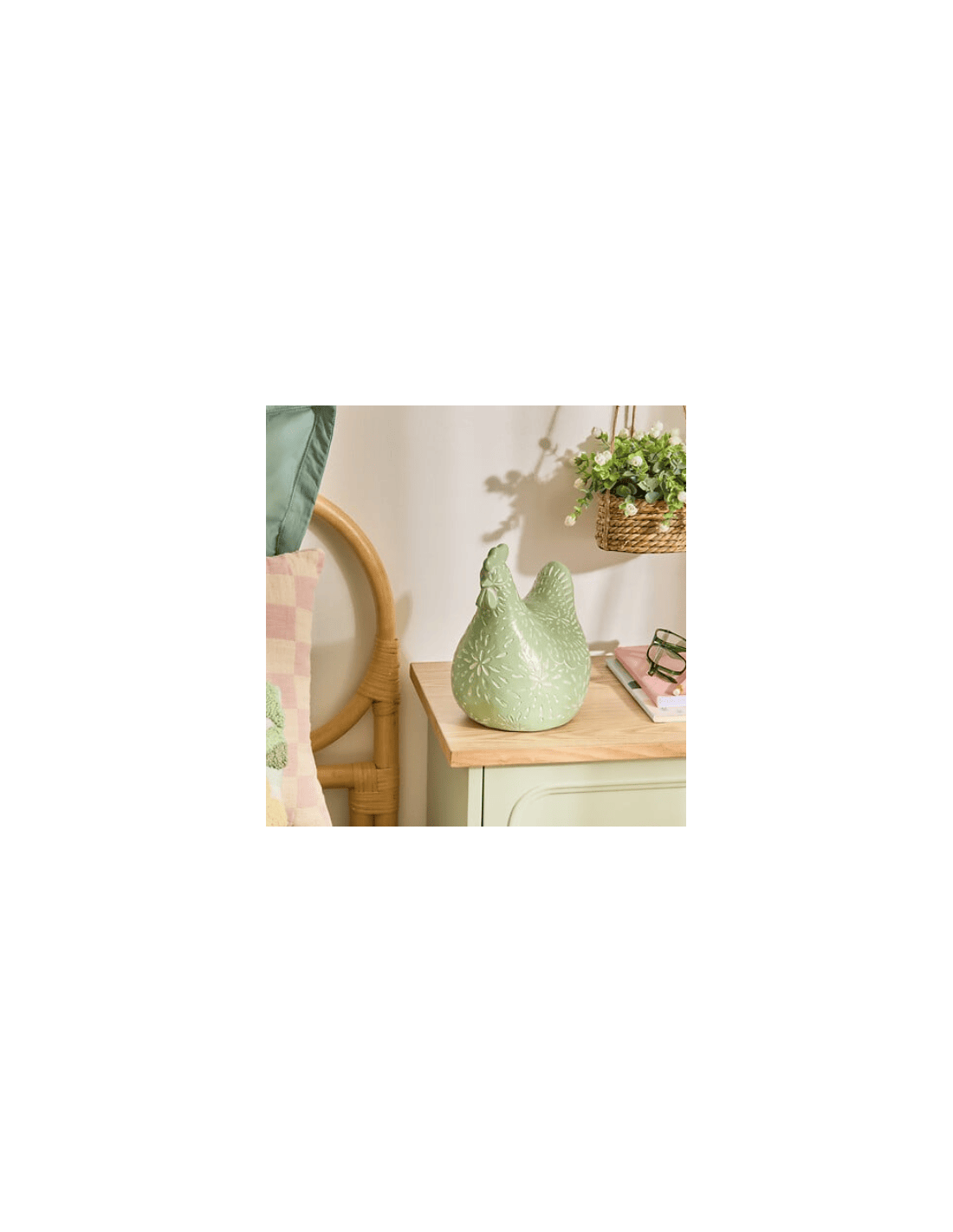 Apportez une touche champêtre et chaleureuse à votre intérieur avec cette charmante poule décorative, de couleur vert. Élégamment conçue pour se poser sur vos étagères, tables ou rebords de fenêtre, elle mesure 20 cm de hauteur, ce qui en fait un accessoire discret mais raffiné pour sublimer votre décoration. Sa finition soignée et ses détails réalistes capturent l’essence d’une poule de ferme tout en ajoutant une note artistique à votre espace. Que ce soit dans un salon, une cuisine ou même une véranda, cette pièce décorative se marie facilement avec différents styles, du rustique au contemporain. Léger et facile à déplacer, elle peut également être utilisée comme idée cadeau originale pour les amateurs de décoration ou les amoureux de la nature. Transformez votre intérieur en un lieu convivial et plein de charme avec cette poule beige qui apportera chaleur et caractère à chaque coin de votre maison.