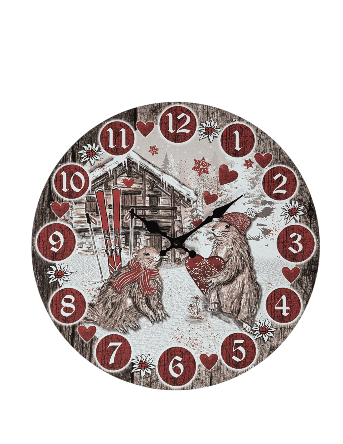 Apportez une touche d’authenticité et de douceur à votre intérieur avec cette horloge à la décoration montagnarde, aussi charmante qu’originale. Véritable invitation à l’évasion, elle met en scène deux adorables marmottes réunies devant un chalet en bois, symbole de convivialité et de tradition alpine. Les petits cœurs rouges délicatement intégrés au décor renforcent l’atmosphère chaleureuse et pleine de tendresse de cette pièce unique.