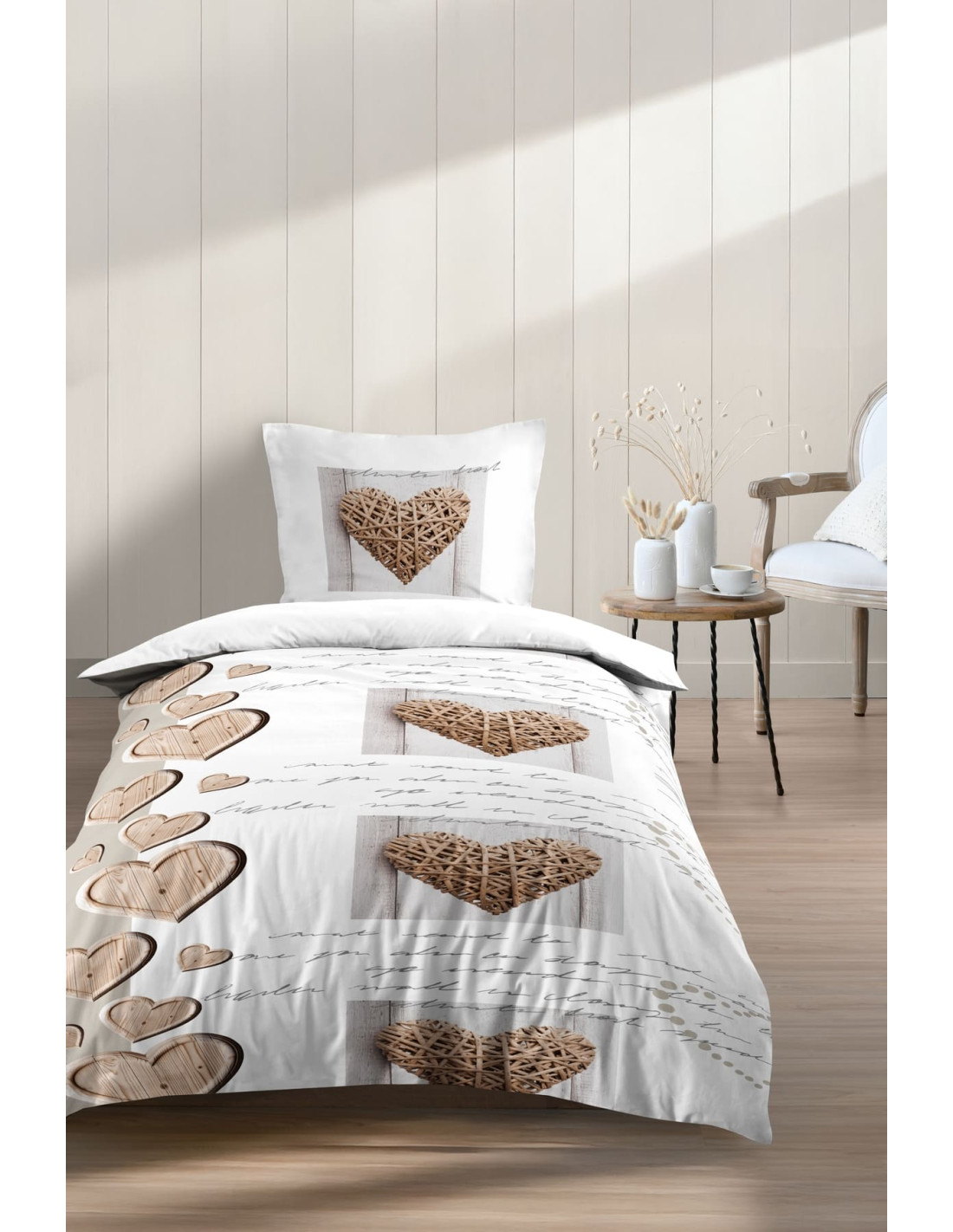 Dès le premier regard, le motif de cette housse de couette séduit par ses cœurs tressés en bois et son design naturel. Les teintes boisées se marient harmonieusement aux nuances douces du blanc et du beige, évoquant le bois brut, les intérieurs authentiques et les maisons de montagne. Cette esthétique inspirée du style chalet donne immédiatement une touche chaleureuse et apaisante à votre décoration intérieure. Parfaite pour une chambre à la décoration rustique ou scandinave, elle apporte une note tendance et naturelle.