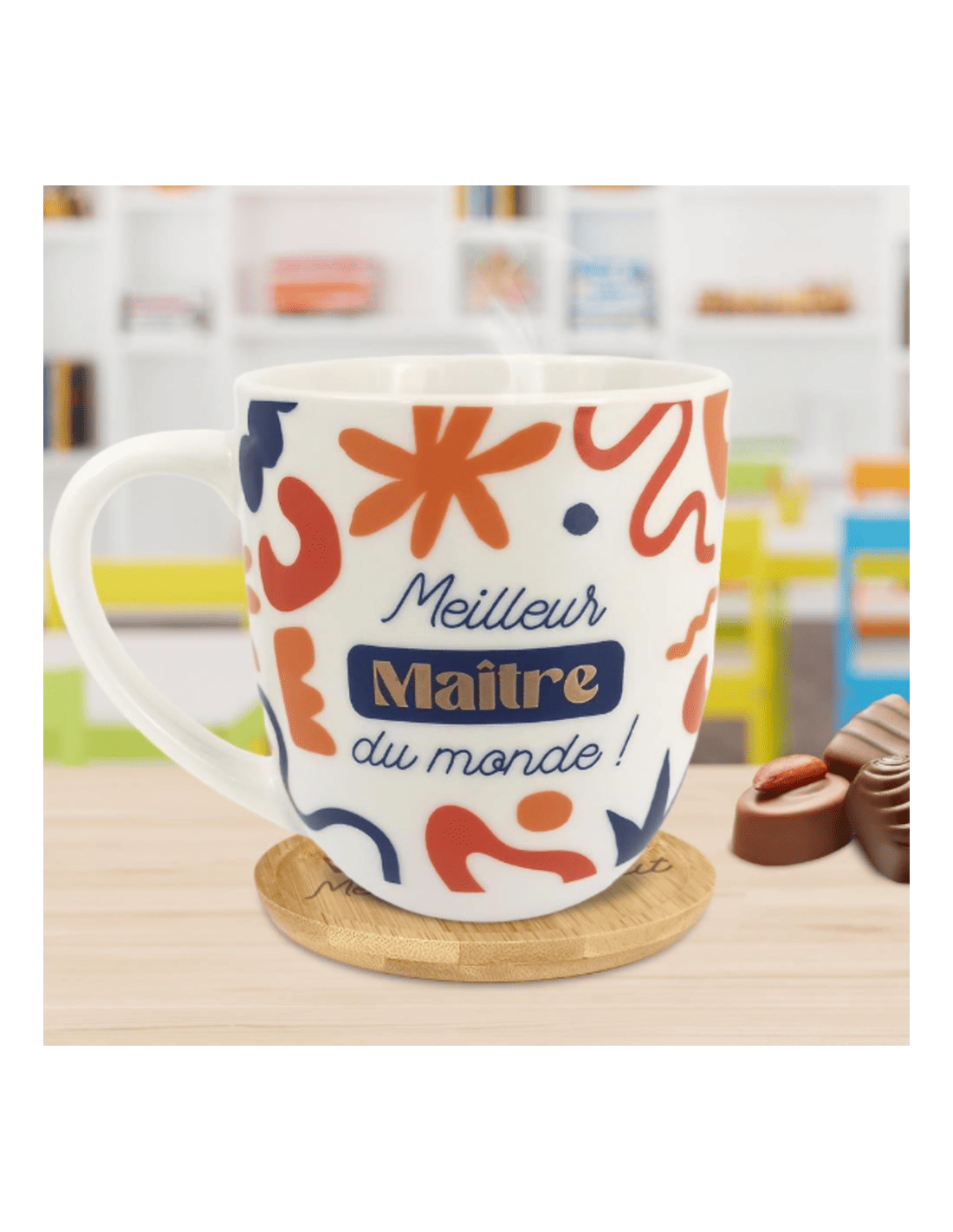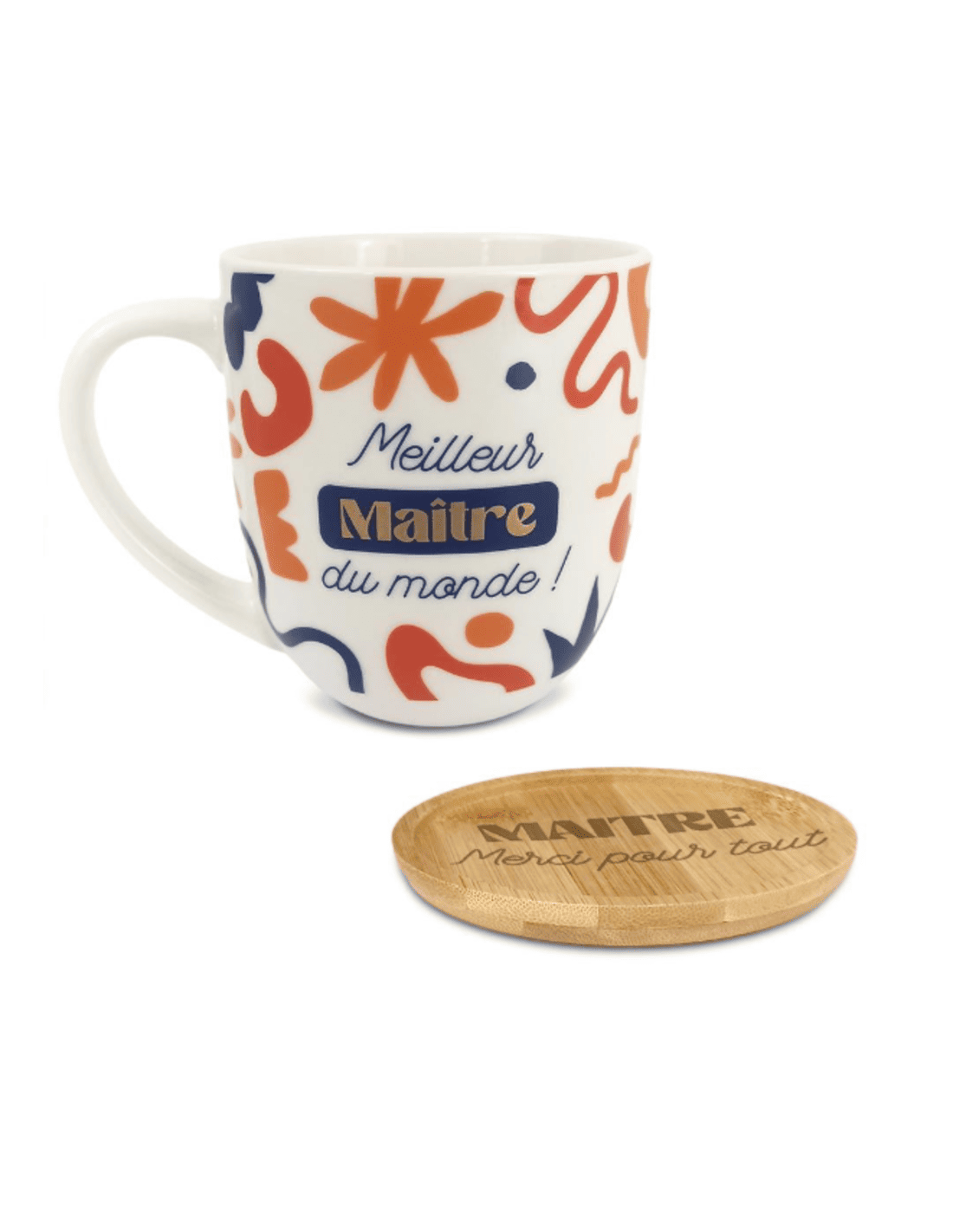 Ce coffret est composé d'un mug à motifs abstraits avec la mention "Meilleur maître du monde" ainsi qu'une sous-tasse circulaire en bois "Maître merci pour tout". Parfait pour les pauses café ou thé !