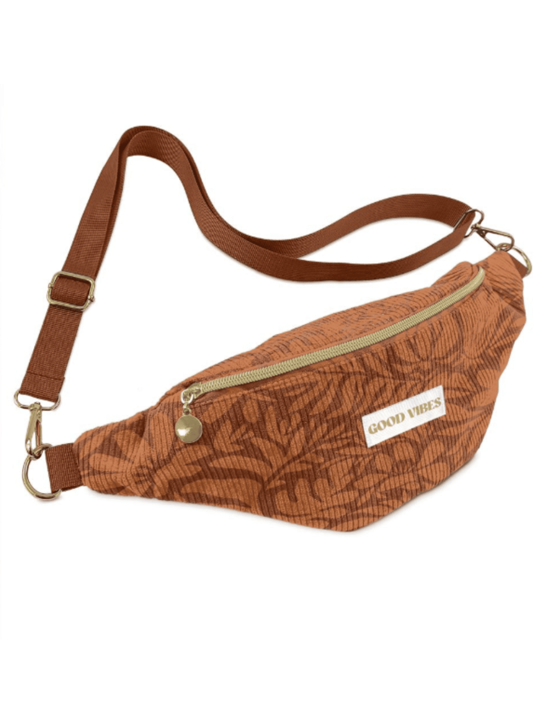 Avec sa teinte chaude et naturelle, son motif subtilement végétal et son inscription "GOOD VIBES", ce sac banane dégage une aura positive et affirmée. L'inscription blanche contrastée attire l’œil tout en envoyant un message fort et bienveillant. Le mélange entre l’esthétique vintage du velours côtelé et la modernité de la coupe en fait une pièce unique, à la croisée des styles rétro et contemporain.