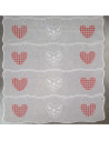 Son design associe la transparence élégante d’un voile blanc brodé à de jolis petits cœurs vichy rouges, alternés avec des cœurs brodés blancs aux motifs floraux délicats. Cette combinaison apporte un esprit rustique chic et intemporel, parfait pour retrouver l’atmosphère chaleureuse des maisons de montagne et des séjours à la campagne.